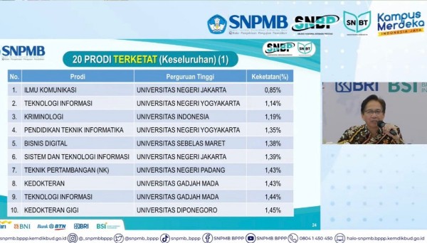 “Prodi ilmu komunikasi Universitas Negeri Jakarta memperoleh nilai keketatan sebesar 0,85 persen. Ini, bisa dikatakan dalam 100 pendaftar hanya satu yang diterima,” kata Ketua Umum Seleksi Nasional Penerimaan Mahasiswa Baru (SNPMB), Mochamad Ashari dalam konferensi pers di Kantor Kementerian Pendidikan dan Kebudayaan, Jakarta Pusat, Selasa 20 Juni 2023.