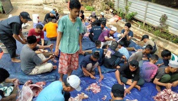 Usai pemotongan dan pendistribusian qurban yang dikoordinir M. Saufi dan Imam Saroji, disebarkan langsung para santri Ponpes Almarhamah kepada warga sekitar Ponpes, digelar makan bersama.